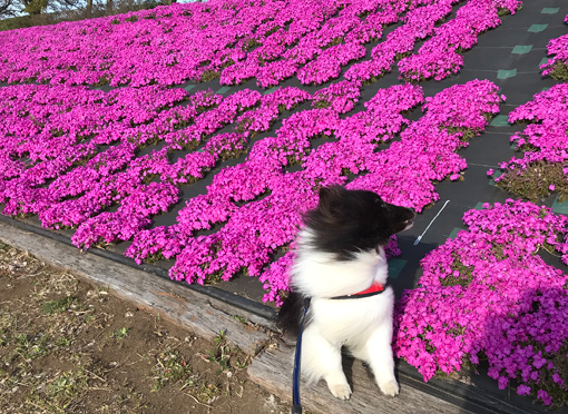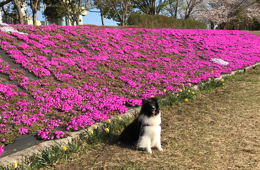 カイ君のお散歩で河原を歩いていたら そうだ、ここは芝桜で有名?な場所 まだ満開ではなかったけど せっかくだから記念撮影